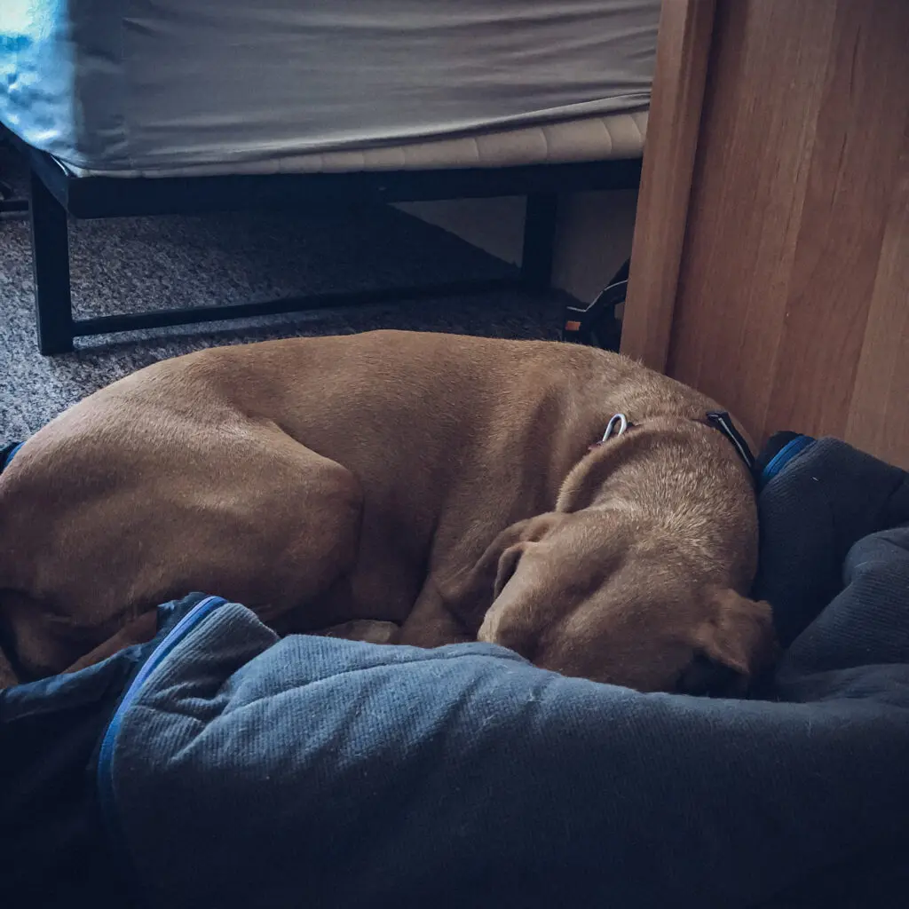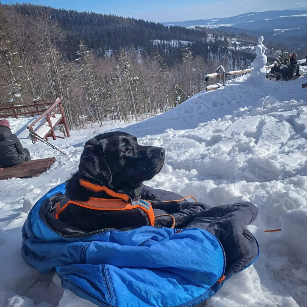 Śpiwór Ly od Non-stop dogwear w trakcie przerwy zapewni psu ciepło, dzięki czemu oszczędzi energię ciała na ogrzanie organizmu.