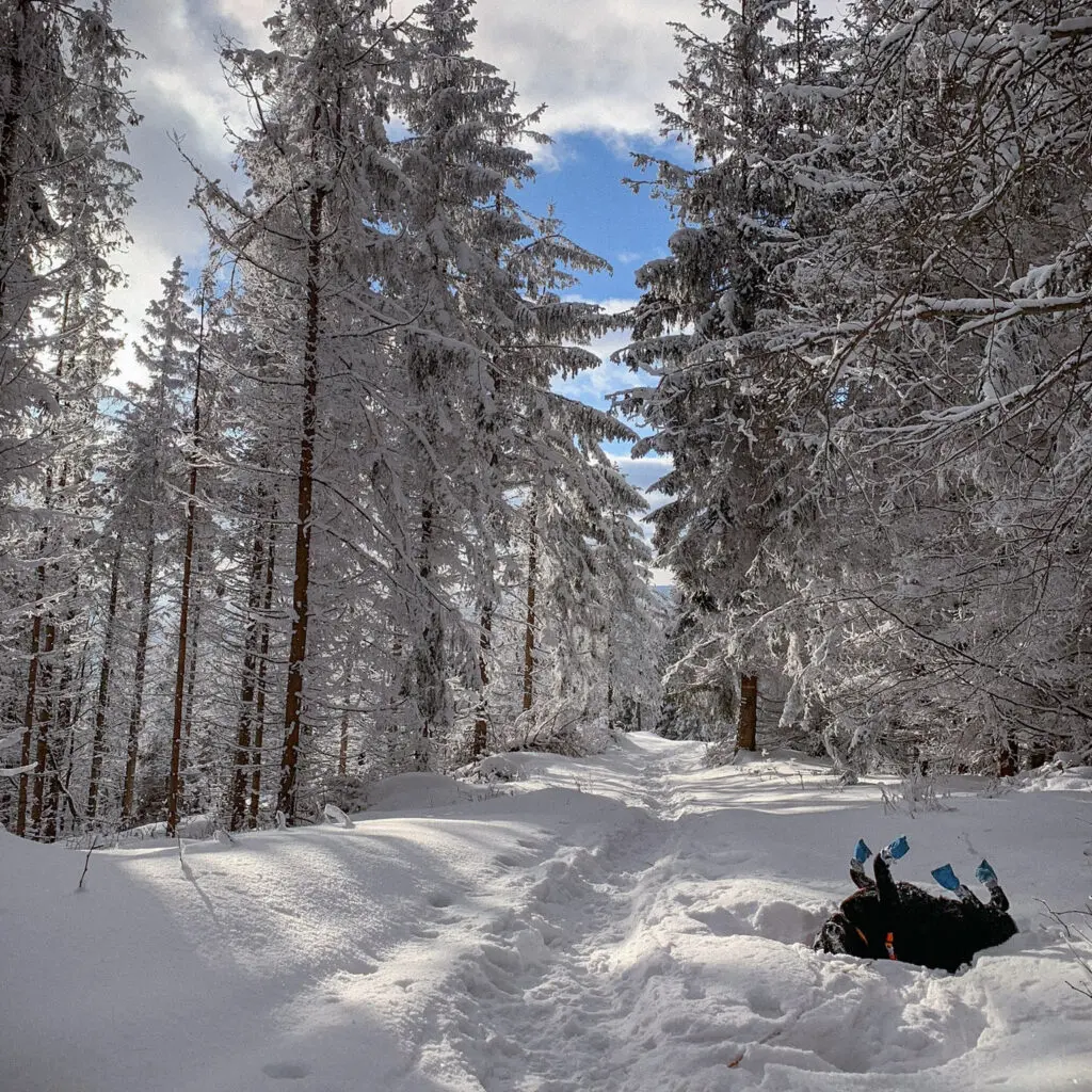 BUTY – moje ulubione! Chyba najczęściej zadawane pytanie, to „Czy pies musi mieć buty?” I tu idzie najlepsza odpowiedź: „To zależy!”. Zależy od nawierzchni, długości trasy czy tego, jak Twój pies chodzi. Nagłe zrywy i hamowania zdecydowanie zwiększają ryzyko urazów. Kamienisty szlak – podobnie. Śnieg – a jakże! Sama wychodzę z założenia, że lepiej zapobiegać niż leczyć, bo raz musiałam praktycznie znosić 28kg żywej labradorskiej masy z Malinowskiej Skały na Przełęcz Salmopolską i nie było w tym nic fajnego. Na skaliste lub mieszane szlaki wybieram buty PROTECTOR. Wspomniane wyżej 75km trekkingu moje psy zrobiły właśnie w nich. (Oczywiście nie w całości, bo buty musimy psu co jakiś czas zdejmować). Na GSB w sporym śniegu i dużym mrozie Louisowi wygodniej się szło w butach LONG DISTANCE. Materiały obu modeli są różne: Protector są mocne i sztywniejsze, Long distance cienkie i idealne na puch. Na szlakach panują też różne warunki, zatem na długi trekking dobrze mieć oba modele i ubierać psu według aktualnej potrzeby.
