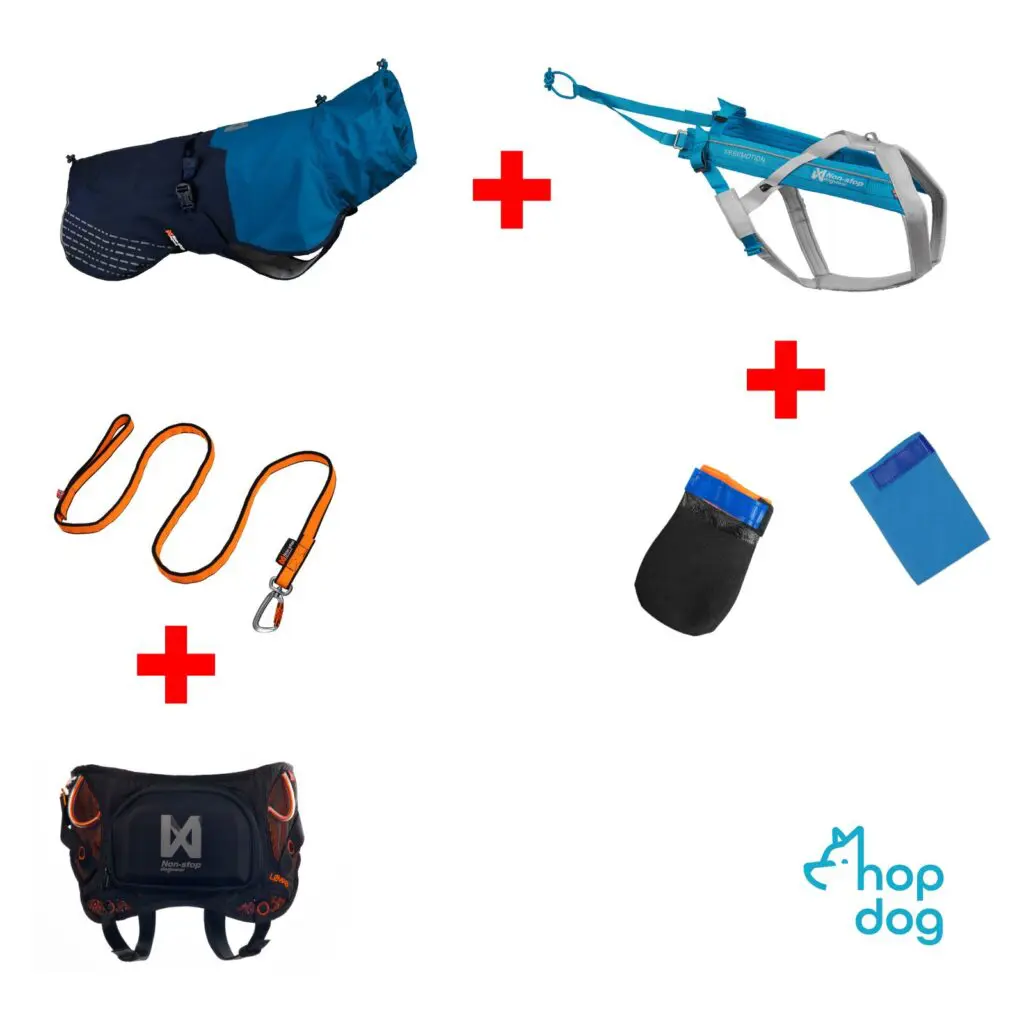 Płasz Fjord + Freemotion 5.0 + buty Protector i Long distance dla psa. A dla dogtrekkera: smycz Bungee i pas Løype